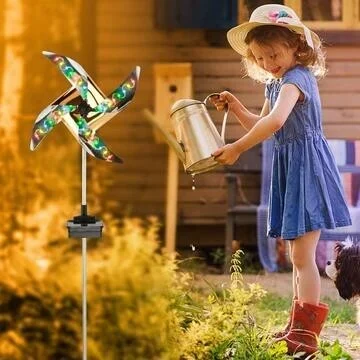 The solar wind spinner is powered by solar panels. At nightfall, the windmill will light up with flashing lights in four colors: red, yellow, blue and green. The four blades will rotate continuously with the light cone.